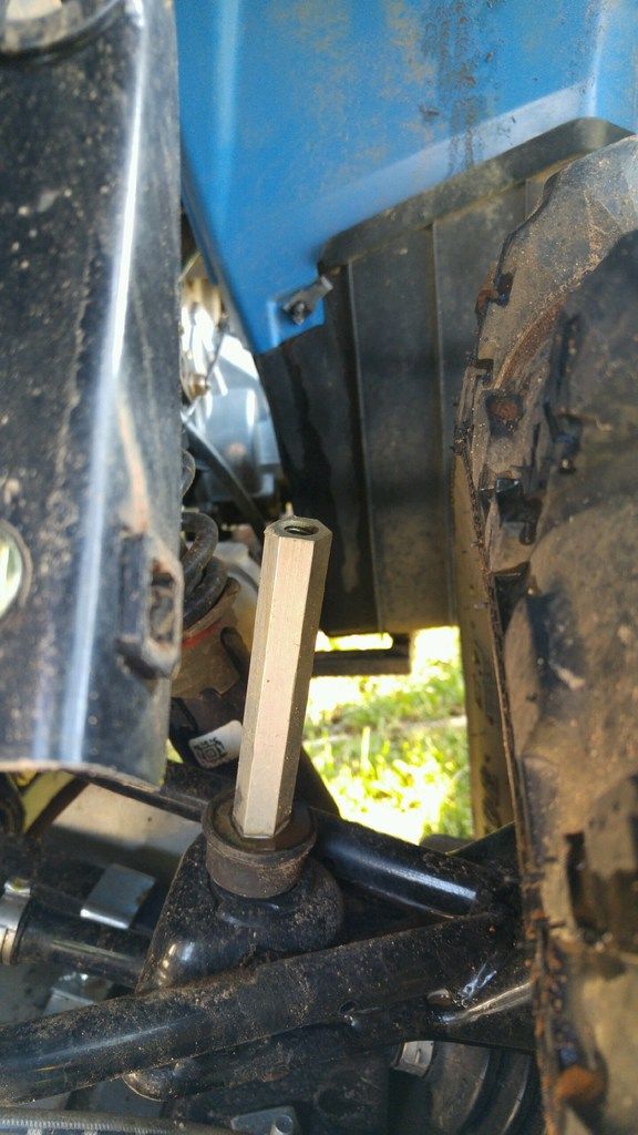 However, it turns out that there could potentially be an issue by using this method. bi66badjohn sent me a couple of pictures of his 570. I went out and looked at mine, and it was exactly the same. The strut on the right hand side will hit the muffler during extreme travel, and could poke a hole in it. Guess I will have to take a look and figure out a fix for this, without making it a PITA to disconnect/re-connect.