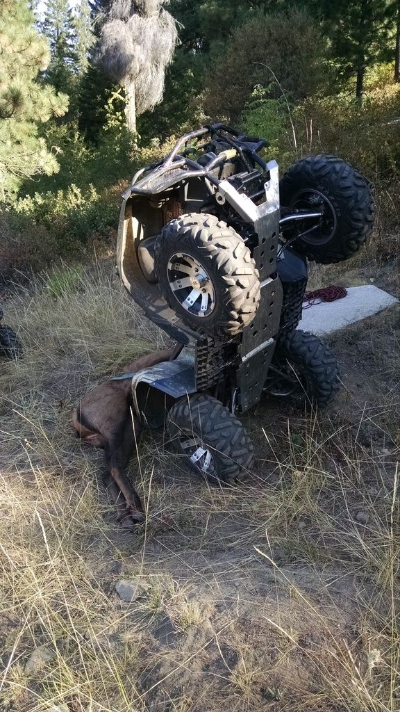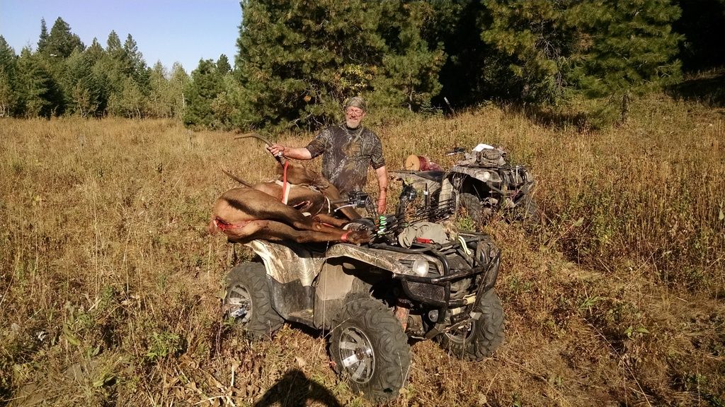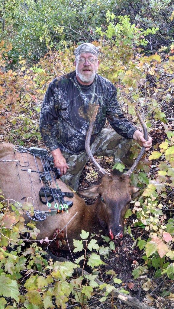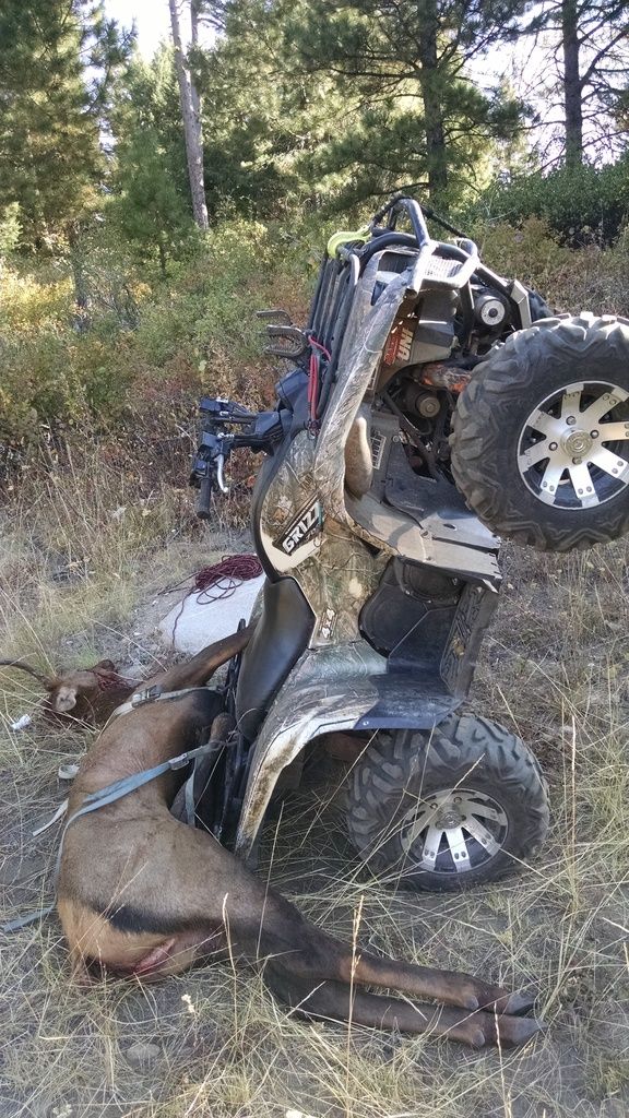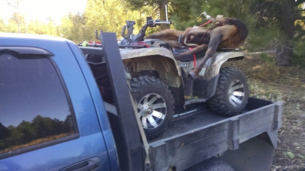After passing on a cow elk opening weekend of archery i called in a little spike bull .. The shot got lung so he didn’t suffer for long and only went about 30 yards before he expired… He will be some good eating for sure… I usually just use the Grizzly to drag them out as some of you have seen in posts for past years but he was easy to get to and it was a cool day so i told my partner i wanted to load him like we have had to do occasionally in years past but didn’t get pics.. I have mentioned on here about standing the Grizz on it’s but and using ratchet straps to hold him(elk) to the rack and then pull the front end back down then just adjust and finish tying down and hauling out.. So any way here are some pics of the bull and i along with loading it on the grizz and on to truck… It was a great day just being the mountains and time with friend and my gal, who happened to shoot her very first grouse ever….What a Gal !!!!!!!!! Enjoy the pics..