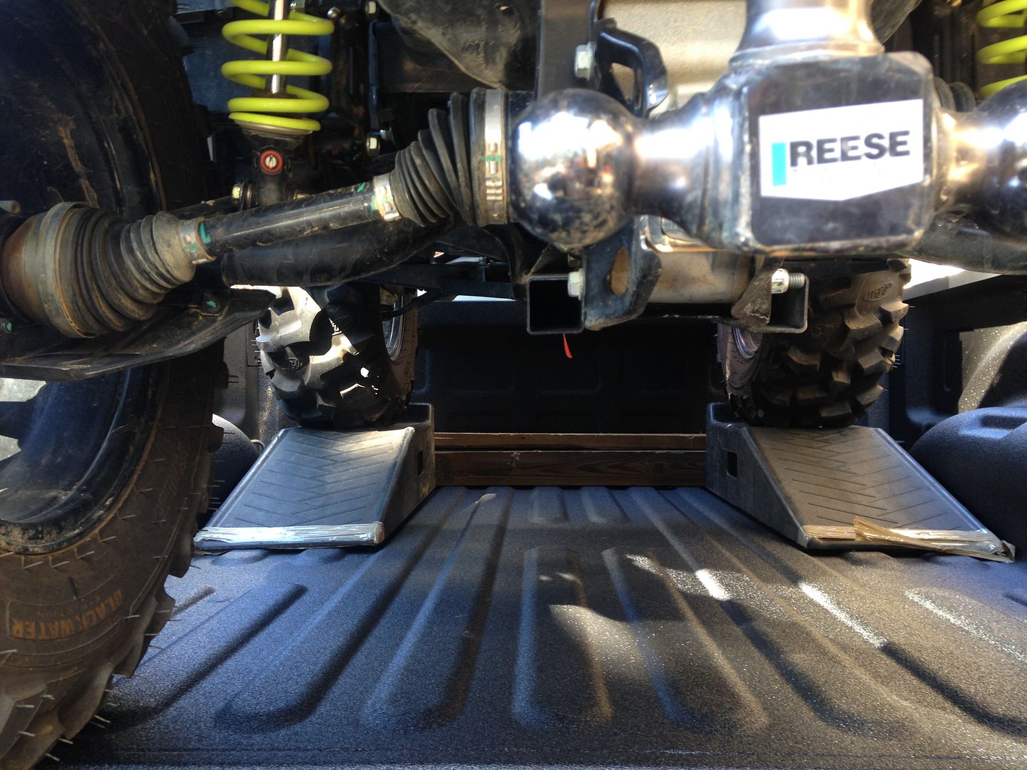 I grabbed a simple set of 6 inch tall rhino ramps and tow pieces of 4×4. I laid the wood side-by-side in the front of the bed. Place the rhino ramps up against the wood. This acts just like an ATV riser but without the bigger height. The 6 inch height difference lose the rear axle in about three or 4 inches.