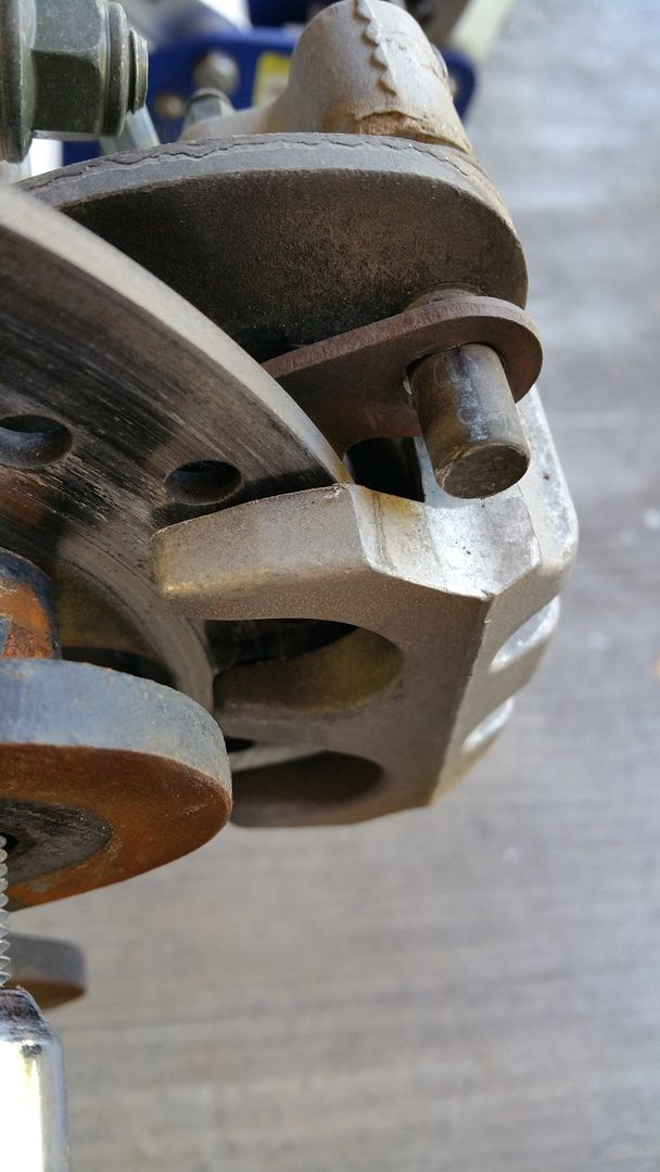 …yup, the outter brake pad is completely missing. Not like the friction material is worn down, but the pad, backing plate and all is completely gone. If you look you can see how the inner pad’s backing plate slides over the caliper slide studs. Well, the outer does that too. I really can’t imagine how everything moved around enough to actually let the pad fall completely off, but I guess it did. I suppose it could have broke to pieces, but I can see the steel backing plate breaking like that.