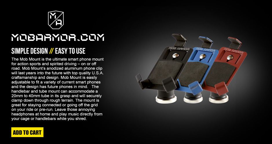 The Mob Mount is the ultimate smart phone mount for action sports and spirited driving — on or off road. Mob Mount’s anodized aluminum phone clip will last years into the future with top quality U.S.A. craftsmanship and design. Mob Mount is easily adjustable to fit a variety of current smart phones and the design has future phones in mind. The handlebar and tube mount can accommodate a 20mm to 40mm tube in its grasp and will securely clamp down through rough terrain. The mount is great for staying connected or going off the grid on your ride or pre-run. Leave those annoying headphones at home and play music directly from your cage or handlebars while you shred.
