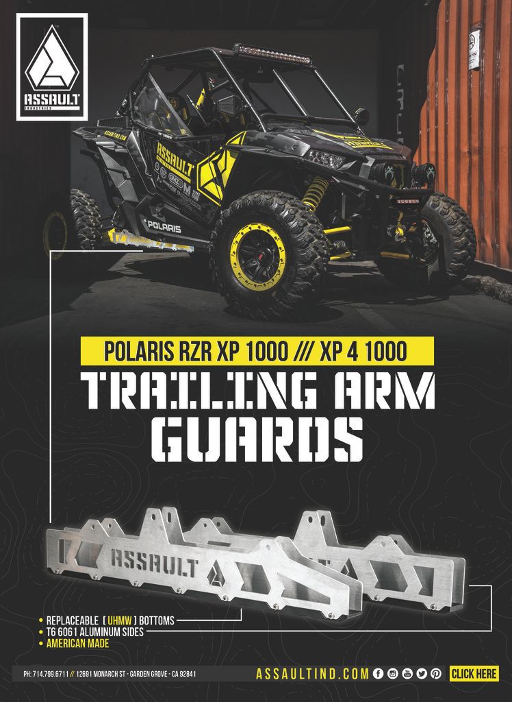 Polaris RZR XP 1000 and XP 4 1000 rear trailing armor guards made out of T6 6061 aluminum. Laser cutouts on the side. The bottom is constructed of UHMW for strength and durability. Protect your trailing arms with our brand new guards. In our design the UHMW is also replaceable if needed.