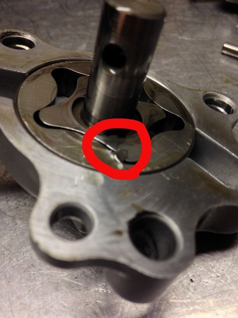 Now that I had the top end squared away, I needed to know what caused all this carnage in the first place. I pulled off the oil pump and noticed the shaft on it would not spin. Upon closer inspection I noticed a little metal shard wedged in it. You can just barely see it sticking up in this pic