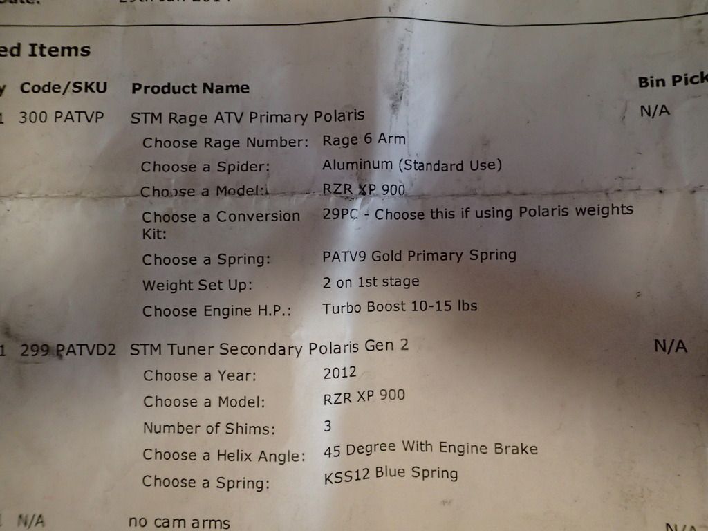 Polaris RZR Parts For Sale STM Rage 6 Primary & Secondary – XP June 8, 2015 Complete STM Rage 6 primary & secondary for XP900 RZR. Setup for 13-15 psi boost but includes arms and spring for N/A use as well. Includes all tools and weight kit. About 1000 miles. $1200 OBO shipped to continental US. Bryan, 775-240-3738 9am-9pm Daily PST. Share this:Click to share on Twitter (Opens in new window)Click to share on Facebook (Opens in new window) Related