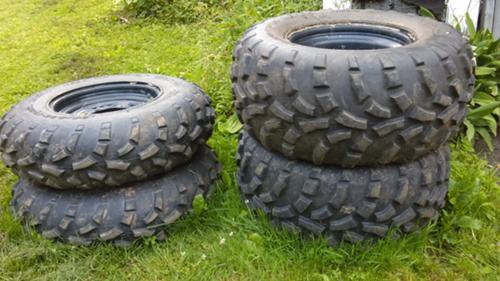 For Sale: Steel wheels and tires from a 2012 sportsman. Tires have about 22/32" of tread remaining and have no plugs.