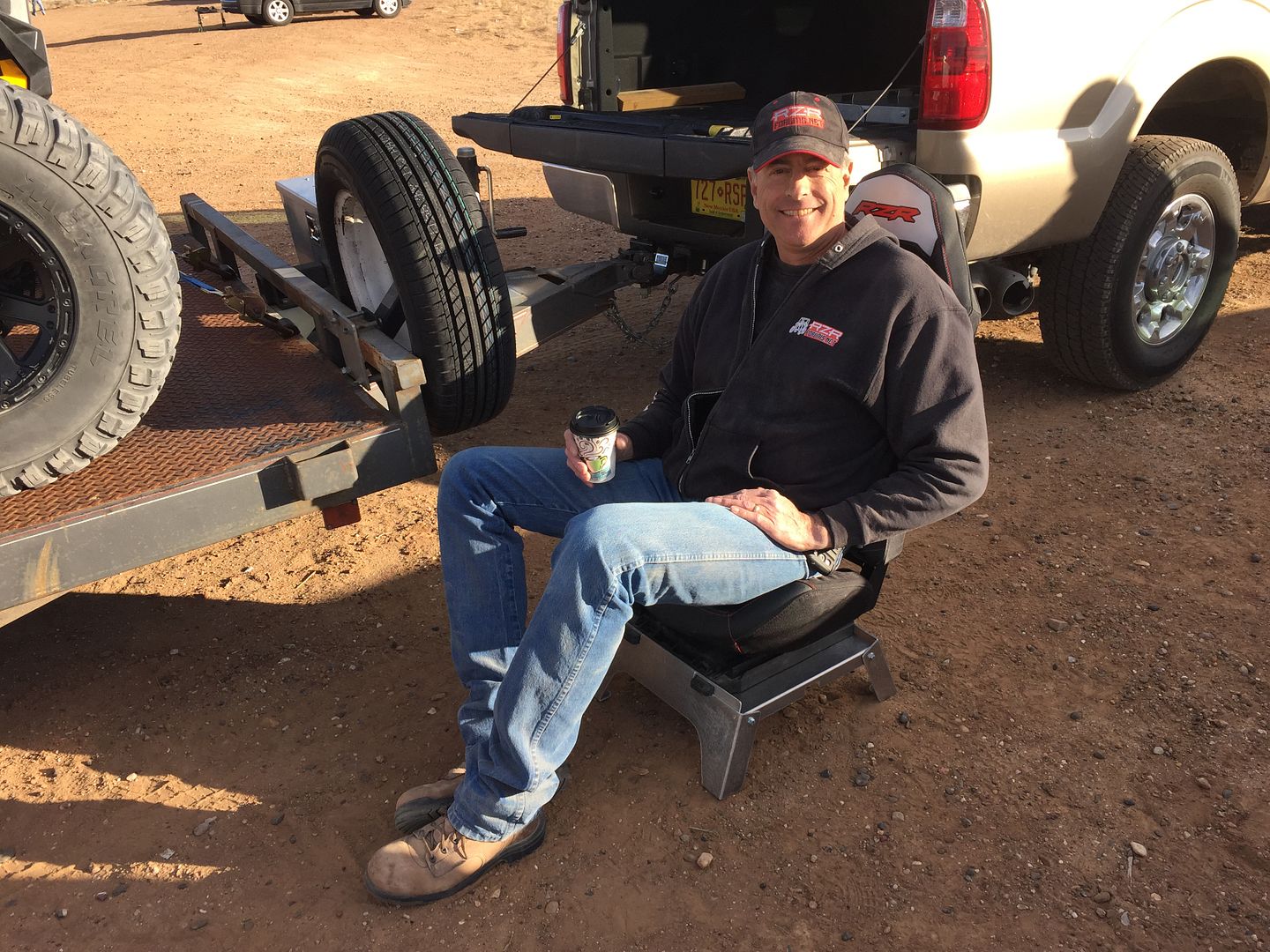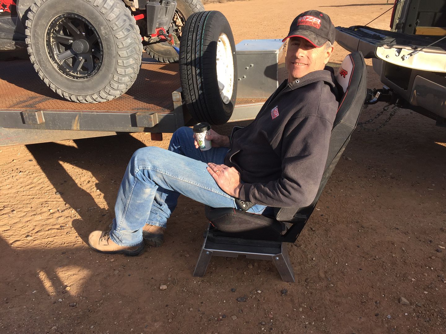 Gregg sitting on ISOTA Offroad new seat stand .Pull your seat and drop in in their new stand and you have a great seat for the campfire .
