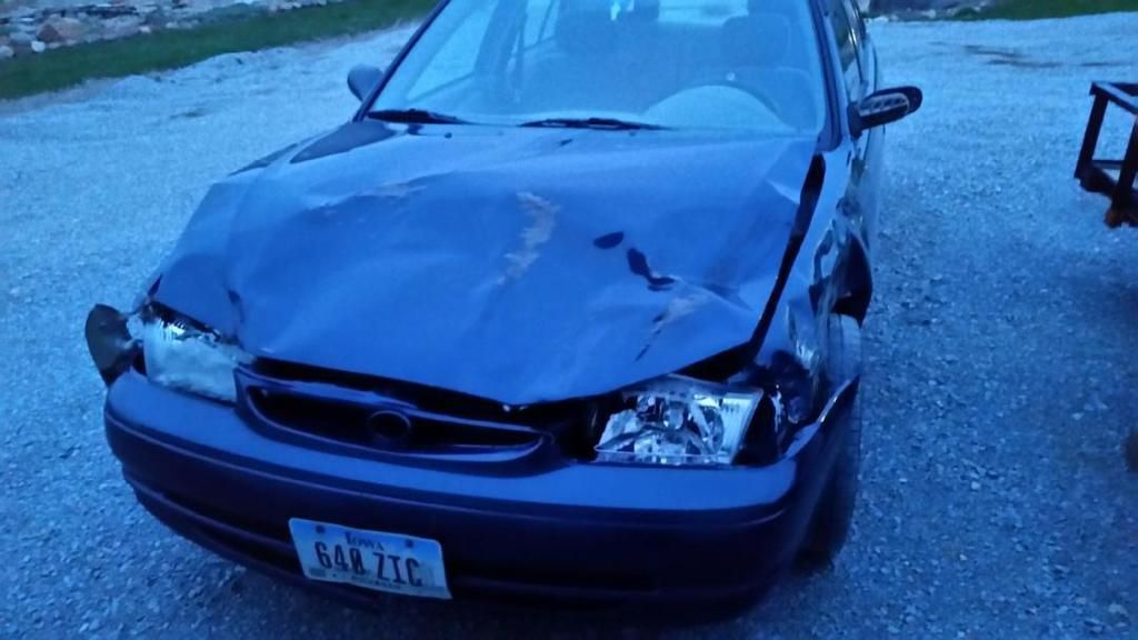 Member Geerig is the mad max, road rage, deer slayer of the midwest. He and his work beater Toyota corolla that is. On his way to work this a.m. he texted me pic of car he drove back home, and said he hit a deer broadside that jumped out of the ditch. Later in the day he sent me a text that his wife went to scope out the area, and there were 2 dead deer, 1 on each side of road and it helped explain why left side of his car got so mangeled.