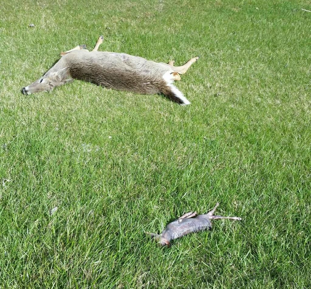 Well, just got pictures, and it was 3 deer total. Don’t know if mama gave birth before dieing, or if it was popped on on impact, or what, so 2 adult and 1 infant deer at same time…amazing stuff.
