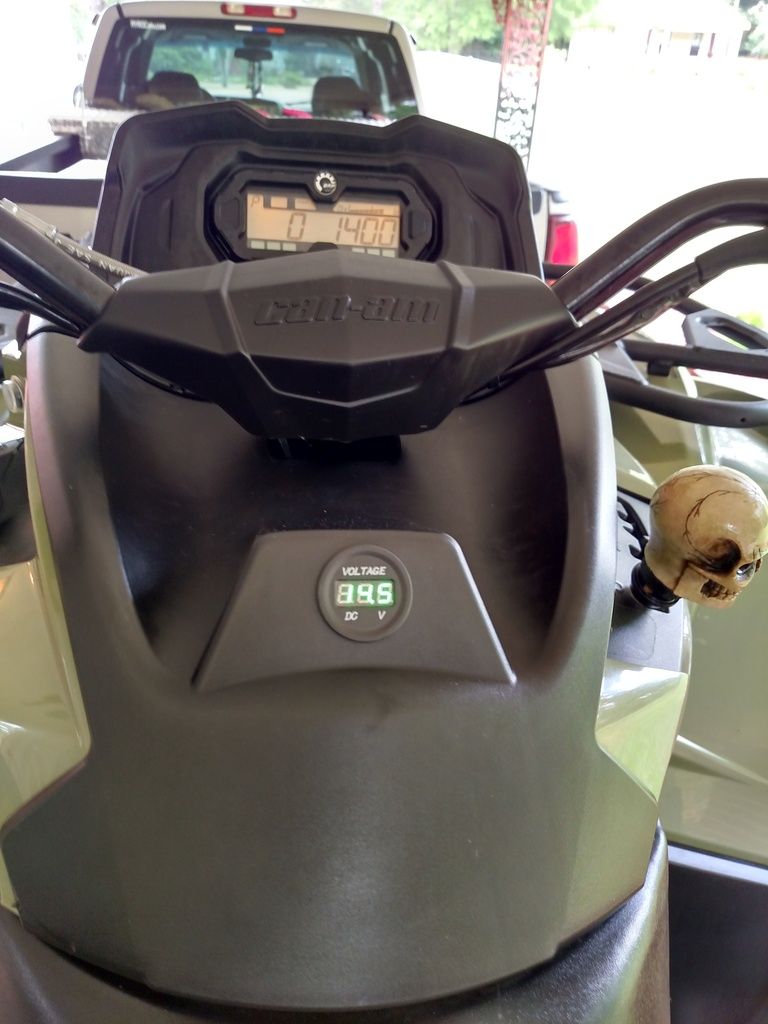 Added a voltmeter to the Outlander today. I run a 40 gallon tow behind sprayer and wanted to keep an eye on the voltage as well as for my extra lighting. $5 eBay waterproof voltmeter. I soaked it with the hose for a while just to test its waterproof claim and it works great! Well worth the money!